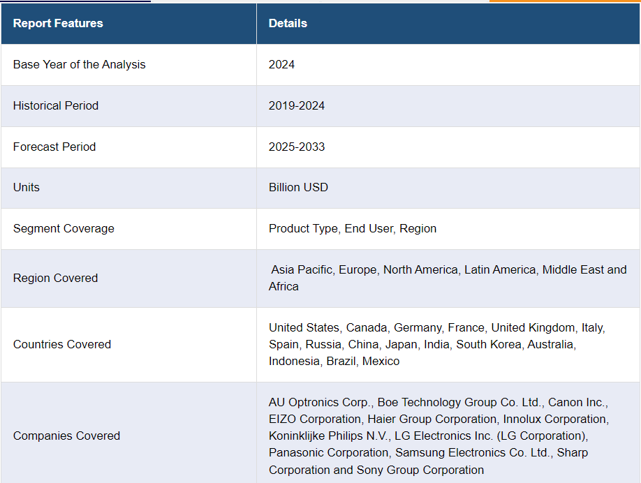 IMARC 그룹은 글로벌 4K 디스플레이 해상도 시장 보고서의 각 하위 세그먼트의 주요 동향에 대한 분석과 함께 2025-2033 년 글로벌, 지역 및 국가 수준에서의 예측을 제공합니다. 이 보고서는 제품 유형과 최종 사용자를 기준으로 시장을 분류했습니다.