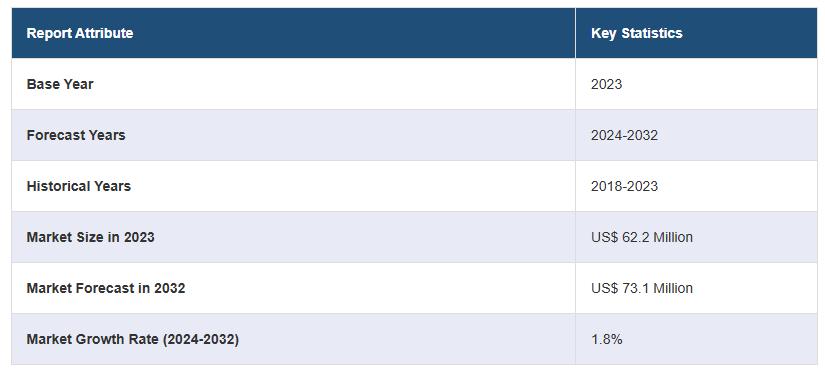글로벌 5- 하이드 록시 메틸 푸르 푸랄 시장 규모는 2023 년에 미화 6,220 만 달러에 달했습니다. 앞으로 IMARC Group은 2024-2032년 동안 1.8%의 성장률(CAGR)을 보이며 2032년까지 시장이 7,310만 달러에 달할 것으로 예상하고 있습니다. 견고한 성장 전망, 지속 가능한 화학 및 산업 혁신에서의 관련성 증가, 바이오 기반 화학 물질에 대한 수요 증가, 화학, 재료 및 제약과 같은 여러 부문의 다양한 응용 분야의 빌딩 블록에서 제품 적용 증가는 시장 성장에 기여하는 요인입니다.
