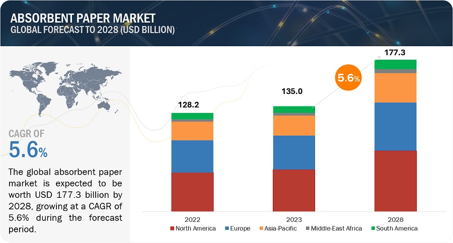 전 세계 흡수성 종이 시장 규모는 2023년 1,350억 달러로 추정되며, 2028년에는 5.6%의 연평균 성장률로 1,773억 달러에 달할 것으로 예상됩니다. 흡수성 종이는 액체와 수분을 빠르게 흡수하도록 설계된 다공성 소재입니다. 습식 크레이프, 건식 크레이프, 티슈, 스크림 강화지는 개인 위생, 의료, 홈 케어, 미용 및 포장에 사용되는 다양한 유형의 흡수성 종이입니다. 부드러움으로 유명한 티슈 페이퍼는 빠른 액체 흡수력이 뛰어나 미용 티슈와 종이 타월에 사용됩니다. 미세한 구멍으로 설계된 커피 필터는 커피 찌꺼기를 분리하는 동시에 액체가 투과할 수 있도록 하는 데 능숙합니다. 스크림 강화 티슈는 강화 메쉬를 통해 강도를 통합하여 의료 및 산업용 물티슈와 같이 흡수력과 내구성이 모두 요구되는 용도에 이상적입니다. 이러한 흡수성 페이퍼는 티슈 페이퍼의 부드러움과 빠른 흡수부터 커피 필터의 정밀 여과, 스크림 강화 티슈의 강화된 강도까지 다양한 특성을 제공하여 특정 요구 사항을 충족하고 산업 전반에 걸쳐 활용도를 높입니다. 전반적으로 흡수성 종이 제품은 다양한 분야에서 청결, 위생, 효율성을 유지하는 데 없어서는 안 될 필수 도구로 사용되고 있습니다.