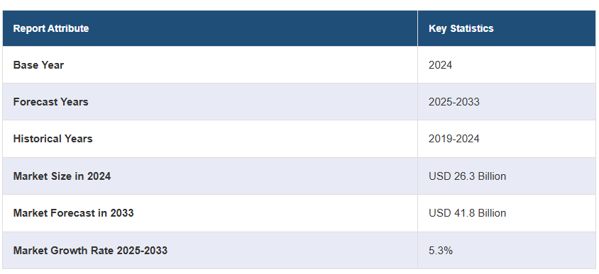 글로벌 AC 드라이브 시장 규모는 2024년에 263억 달러에 달했습니다. IMARC 그룹은 2033년까지 시장 규모가 418억 달러에 달할 것으로 예상하고 있으며, 2025-2033년 동안 5.3%의 성장률(CAGR)을 보일 것으로 전망하고 있습니다. 에너지 효율적인 솔루션에 대한 수요 증가, 신흥 경제국의 급속한 산업화 및 도시화, 재생 에너지 부문의 성장, 사물인터넷(IoT) 및 인더스트리 4.0의 발전, 엄격한 정부 규제, 기술 혁신, 다양한 응용 분야에서 정밀한 모터 제어에 대한 필요성이 시장 확장을 더욱 촉진하고 있습니다.
