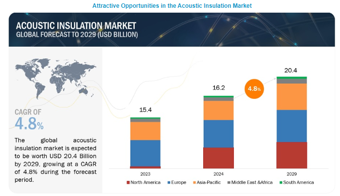 전 세계 방음 시장은 2024년 162억 달러 규모이며 2024년부터 2029년까지 연평균 4.8% 성장하여 2029년에는 204억 달러에 달할 것으로 예상됩니다.