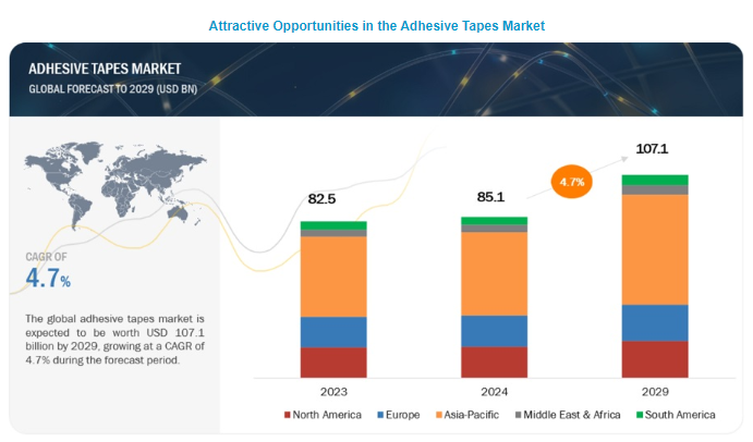 글로벌 접착 테이프 시장은 2024년 851억 달러 규모이며 2024년부터 2029년까지 연평균 4.7% 성장하여 2029년에는 1,071억 달러에 달할 것으로 예상됩니다. 이 지역의 인구가 빠르게 증가하면서 의료비 지출이 증가하고 의료 및 위생에 대한 인식이 높아지면서 의료 제품 및 기기에 대한 수요가 증가하고 있습니다. 접착 테이프는 상처 치료, 수술 절차, 의료 기기 조립 및 고정과 같은 의료 분야에서 중요한 역할을 합니다. 의료 기술의 발전과 접착 테이프 제형의 혁신으로 인해 의료 전문가와 환자의 특정 요구를 충족하는 저자극성, 통기성, 항균성 등의 특성을 갖춘 특수 의료 테이프가 개발되고 있습니다. 아시아 태평양 지역은 급속한 도시화와 인프라 개발로 인해 새로운 의료 시설과 병원이 설립되면서 다양한 의료용 접착 테이프에 대한 수요가 더욱 증가하고 있습니다.