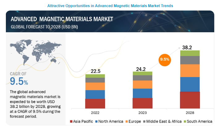 첨단 자성 재료 시장은 2023년 242억 달러에서 2028년 382억 달러로 성장하여 9.5%의 연평균 성장률(CAGR)을 기록할 것으로 예상됩니다. 전 세계적으로 첨단 자성 재료 시장은 크게 확대되고 있으며, 예측 기간 동안에도 비슷한 추세가 이어질 것으로 예상됩니다. 첨단 자성 재료에 대한 수요는 자동차 및 산업용 애플리케이션에서 고효율 모터 및 액추에이터에 대한 수요 증가를 비롯한 여러 요인에 의해 주도되고 있습니다. 첨단 자성 소재의 주요 최종 사용 분야에는 자동차, 전자, 산업, 발전, 의료 등이 포함됩니다.