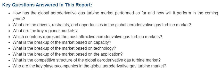 이 보고서는 또한 글로벌 항공기 파생 가스 터빈 시장의 경쟁 구도에 대한 포괄적인 분석도 제공합니다. 모든 주요 기업에 대한 자세한 프로필도 제공됩니다. 이 보고서에서 다루는 기업 중 일부는 Baker Hughes Company, General Electric Company, Mitsubishi Heavy Industries Ltd., MTU Aero Engines AG, Siemens AG 등입니다. 이 보고서는 기업 목록의 일부만을 다루고 있으며, 전체 목록은 보고서에서 제공됩니다.