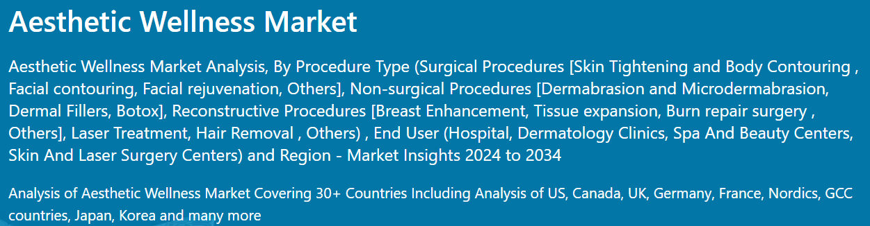 피부 질환 치료, 외모 개선, 피부 기형 치료 등 미용 웰니스 서비스에 대한 수요가 모든 인구 통계 및 연령대에서 시간이 지남에 따라 크게 증가했습니다. 비수술적이며 충격이 적은 미용 치료는 미용 웰니스 서비스의 일부입니다. 미적 웰빙과 성형 수술은 흥미로운 분야이며, 현대 의료계의 최근 유행입니다. 오늘날의 세계에서 사람들은 건강을 유지하고, 건강한 신체를 유지하며, 노화의 징후를 줄이기 위해 노력합니다.