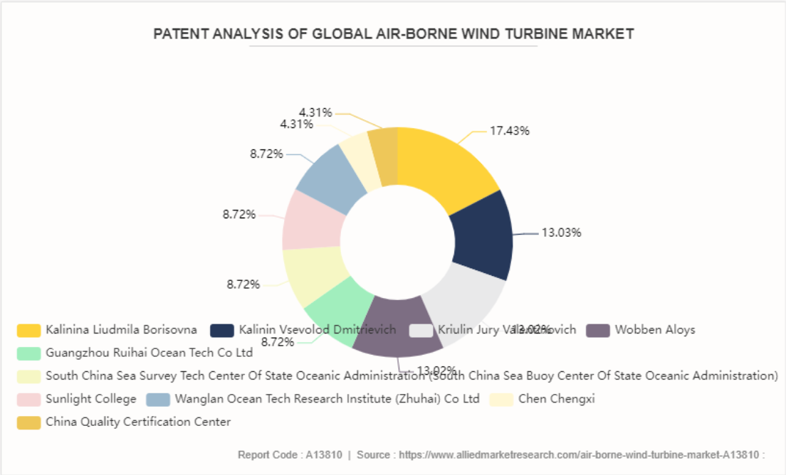 공기역학 풍력 터빈 시장의 주요 특허 보유자는 발전 회사, 연구 기관, 대학입니다. Kalinina Liudmila Borisovna, Kalinin Vsevolod Dmitrievich, Kriulin Jury Valentinovich, Wobben Aloys, Guangzhou Ruihai Ocean Tech Co Ltd, South China Sea Survey Tech Center Of State Oceanic Administration( 중국 해양국 남중국해 부표 센터), 선라이트 칼리지, 왕란 해양 기술 연구소(주하이), 첸 청시, 중국 품질 인증 센터 등이 공기 부양 풍력 터빈 생산 및 응용의 다양한 측면을 다루는 중요한 특허 포트폴리오를 보유하고 있습니다. 연구 기관과 대학은 공기 부양 풍력 터빈의 새로운 용도와 기술 발전과 관련된 특허 출원에 기여하고 있습니다.