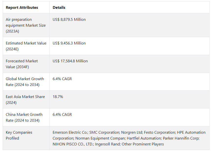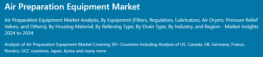 앞서 언급한 사실에 근거하여, 시장 조사 및 경쟁 정보 제공 업체인 Fact.MR에 따르면, 공기 준비 장비 시장은 2024년부터 2034년까지 예측 기간 동안 연평균 6.4%의 성장률을 보일 것으로 예상됩니다.