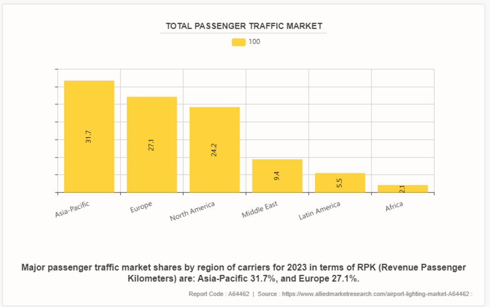 항공 여행에 대한 수요 증가로 예측 기간 동안 공항 조명 시장 수요가 증가할 것으로 예상됩니다. 전 세계 여행이 계속 급증함에 따라 공항은 활동 수준이 높아지고 있으며, 이로 인해 조명 시스템의 개선과 현대화가 필요합니다. 2024년 4월에 국제항공운송협회(IATA)가 발표한 보고서에 따르면, 전 세계 항공 여객 수요는 2023년 2월에 비해 21.5% 증가했습니다. 총 수용 인원은 이용 가능한 좌석 킬로미터(ASK)로 측정되었으며, 전년 대비 18.7% 증가했습니다. 2023년 아시아 태평양 지역은 RPK의 31.7%를 차지하며 세계 여객 수송을 주도했고, 그 뒤를 유럽(27.1%)과 북미(24.2%)가 이었습니다. 중동은 9.4%, 라틴아메리카는 5.5%, 아프리카는 2.1%를 차지하며, 지역별 항공사 시장 점유율의 분포가 다양함을 반영했습니다.