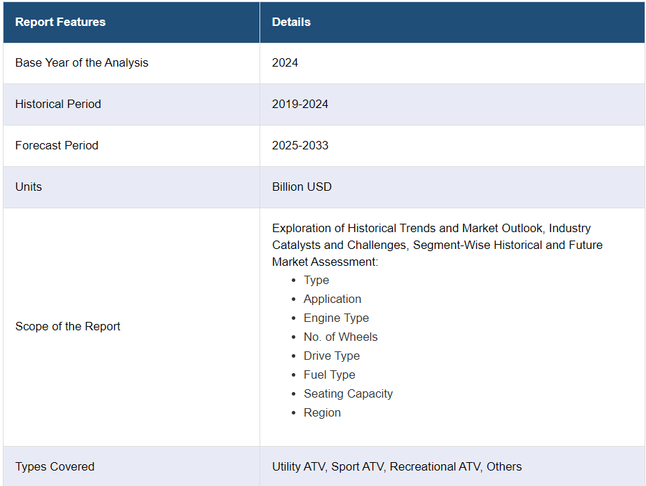 IMARC 그룹은 2025-2033년 글로벌, 지역 및 국가 수준에서 전 지형 차량 시장 예측과 함께 시장 각 부문의 주요 동향에 대한 분석을 제공합니다. 이 보고서는 유형, 용도, 엔진 유형, 바퀴 수, 구동 유형, 연료 유형 및 좌석 수에 따라 시장을 분류했습니다.