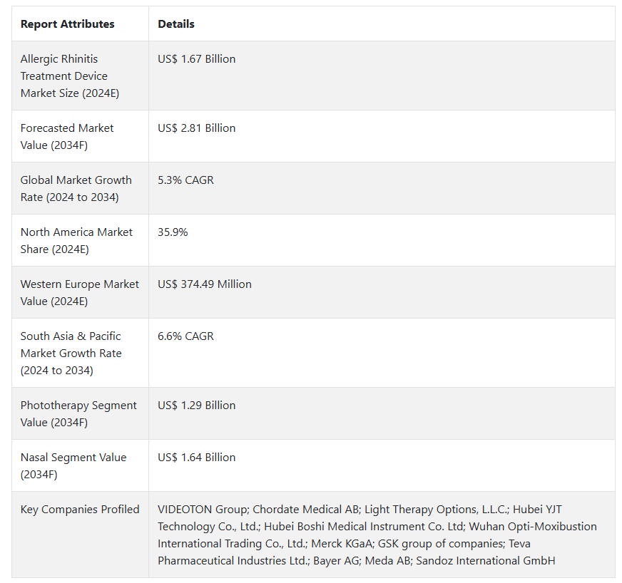 Fact.MR이 발표한 새로운 연구 보고서에 따르면, 전 세계 알레르기성 비염 치료 기기 시장은 2024년에 미화 16억 7천만 달러에 이를 것으로 추정됩니다. 수요는 5.3%의 CAGR로 증가하여 2034년 말까지 28억 1천만 달러의 규모에 이를 것으로 평가됩니다.