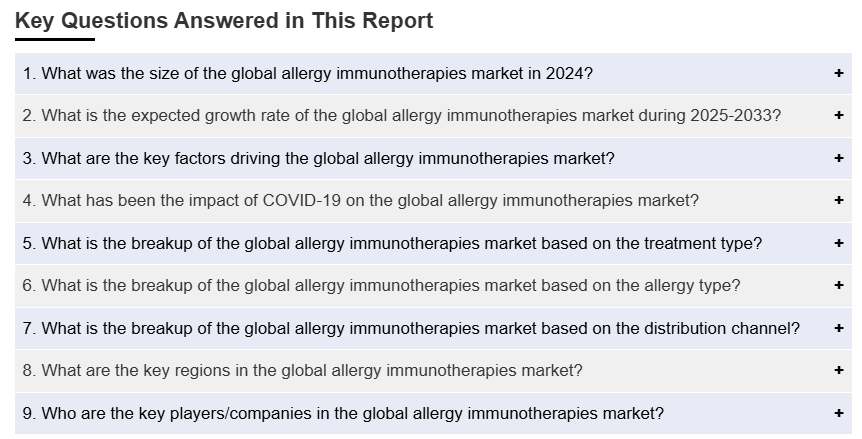 IMARC 그룹은 2025-2033년 글로벌 및 지역별 전망과 함께 각 시장 부문의 주요 트렌드에 대한 분석을 제공합니다. 저희 보고서는 치료 유형, 알레르기 유형, 유통 채널을 기준으로 시장을 분류했습니다.