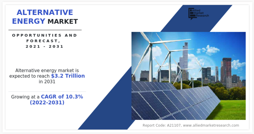 2021년 세계 대체 에너지 시장의 가치는 1조 1천억 달러였으며, 2031년에는 3조 2천억 달러에 이를 것으로 예상되며, 2022년부터 2031년까지 연평균 성장률 10.3%로 성장할 것으로 전망됩니다.
