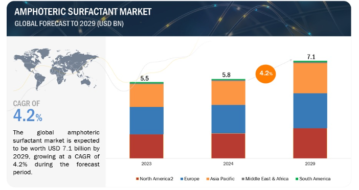 전 세계 양쪽성 계면활성제 시장은 2024년 58억 달러 규모이며 2024년부터 2029년까지 4.2%의 연평균 성장률로 2029년에는 71억 달러에 달할 것으로 예상됩니다. 양쪽성 계면활성제는 다양한 특성으로 인해 점점 더 인기를 얻고 있습니다. 산성 및 알칼리성 환경 모두에서 효과적으로 작동할 수 있어 다양한 용도에 적합합니다. 지속 가능성과 환경 문제에 대한 관심이 높아지면서 제조업체들은 바이오 기반 친환경 계면활성제를 개발하고 있으며, 이는 시장 성장에 더욱 박차를 가하고 있습니다. 이러한 계면활성제는 표면과 장비에 덜 가혹하면서 효과적인 세척 특성을 제공하기 때문에 홈 케어 및 산업용 세척 부문도 시장을 활성화할 것으로 예상됩니다.