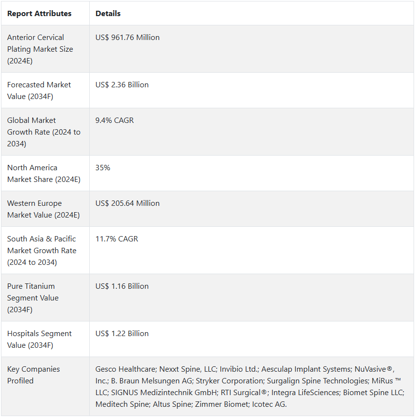 Fact.MR이 발표한 새로운 연구 보고서에 따르면 전 세계 전방 전방 경추 플레이트 시장은 2024년에 미화 9억 6,176만 달러에 달할 것으로 추정됩니다. 수요는 연평균 9.4% 증가하여 2034년 말까지 미화 23억 6천만 달러 규모에 이를 것으로 평가됩니다.
