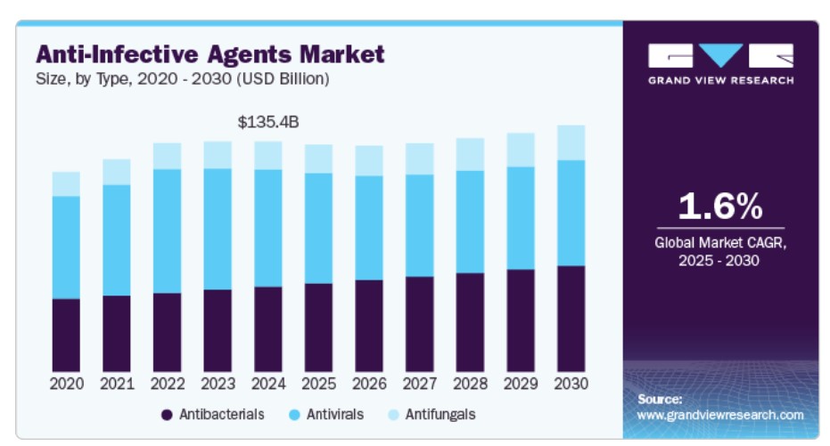 글로벌 항감염제 시장 규모는 2024년 1,354억 3천만 달러로 추산되었으며, 2025년부터 2030년까지 연평균 1.61%의 성장률을 보일 것으로 예상됩니다. 시장 성장의 원인은 감염병의 유행 증가, 의료 투자 증가, R&D의 발전에 기인합니다. 약물 내성 감염의 출현, 정부 지원, 제약 산업의 확장과 같은 요인들이 혁신적인 치료법에 대한 수요를 주도하고 있습니다. 또한, 글로벌 보건 이니셔티브에 대한 관심이 높아지면서 시장 확장이 더욱 가속화되고 있습니다.