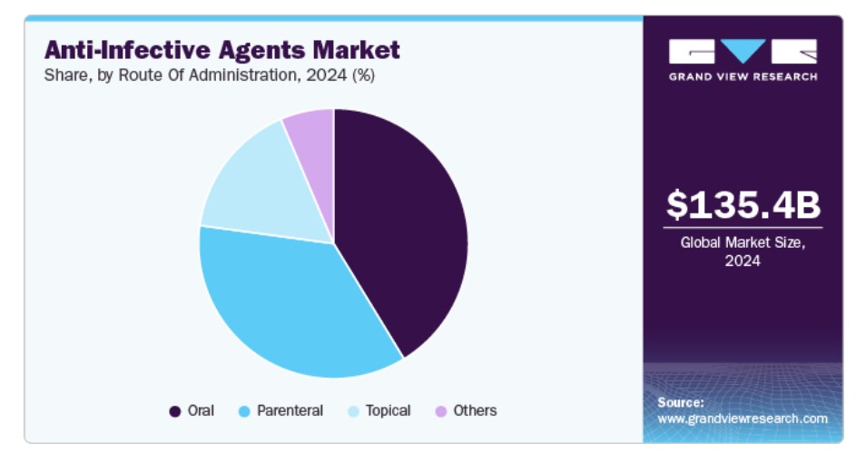 항바이러스 부문이 2024년 50.9%의 점유율로 시장을 장악했습니다. 항바이러스제는 항감염제 시장의 핵심 요소로, 주로 인플루엔자, HIV, 간염, 그리고 최근에는 코로나19와 같은 바이러스 감염의 치료와 예방에 사용됩니다. 전 세계적으로 바이러스 감염이 증가하고, 특히 새로운 변종과 팬데믹의 출현으로 인해 이 부문의 성장이 크게 촉진되었습니다. 그 결과, 항바이러스제 수요가 증가하고 다양한 치료 분야에서 혁신이 이루어지고 있습니다.