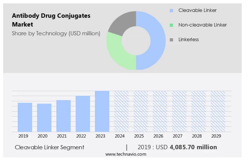 분해 가능한 링커 세그먼트는 글로벌 항체 약물 접합체(ADC) 시장에서 중추적인 역할을 합니다. ADC는 소분자 약물의 효능과 단일 클론 항체(mAb)의 특이성을 결합한 새로운 종류의 치료제를 나타냅니다. 세포 독성 페이로드와 항체를 연결하는 분해 가능한 링커는 암세포 내에서 선택적 약물 방출을 가능하게 합니다. 이 링커는 약물의 성공적인 전달을 위해 표적 세포에서 효과적이고 구체적으로 절단되어야 하며, 약물의 조기 방출을 방지하기 위해 순환 과정에서 안정성을 유지해야 합니다. 효소 절단 및 이황화 결합 제거와 같은 다양한 과정이 링커 절단을 유발할 수 있습니다.