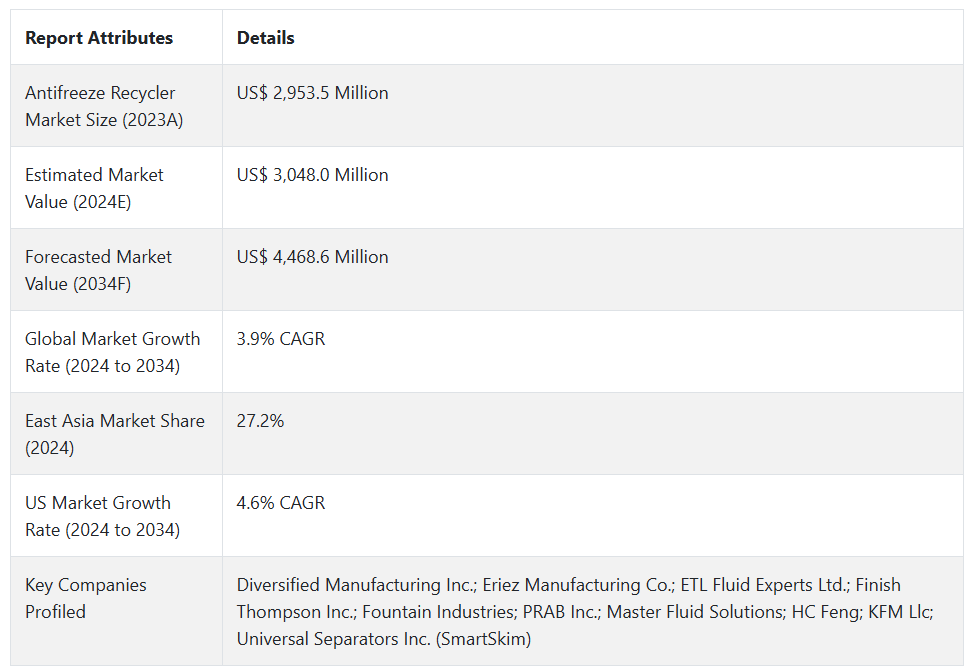 이러한 사실에 근거하여 시장 조사 및 경쟁 정보 제공 업체인 Fact.MR에 따르면, 부동액 재활용 업체는 2024년부터 2034년까지 연평균 3.9%의 성장률을 보일 것으로 예상됩니다.