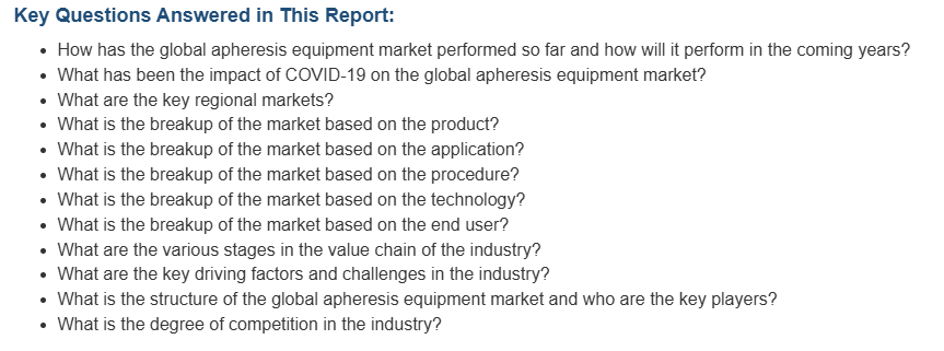이 보고서는 또한 Asahi Kasei Corporation, B. Braun Melsungen Aktiengesellschaft, Baxter International Inc., Fresenius Kabi Aktiengesellschaft (Fresenius SE & Co. KGaA), Haemonetics Corporation, Hemacare Corporation (Charles River Laboratories Inc.), Kaneka Corporation, Kawasumi Laboratories Inc., Medica SpA, Nikkiso Co Ltd. and Terumo BCT Inc. (Terumo Corporation) 등을 조사하고 있습니다.