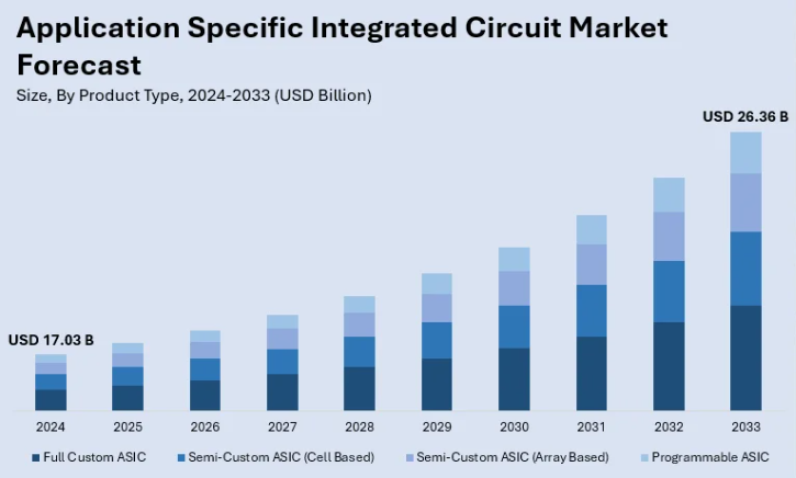 애플리케이션별 집적 회로(ASIC) 시장은 산업 전반에 걸쳐 맞춤형 고성능 에너지 효율적인 반도체 솔루션에 대한 수요 증가에 의해 주도되고 있습니다. 소비자 가전, 자동차, 통신 및 산업 자동화 분야의 성장이 ASIC 채택을 촉진하고 있습니다. 예를 들어, 2023년 11월, 알칩 테크놀로지스는 디자인 솔루션 포럼에서 자동차 IC 생산을 향상시키는 첨단 오토모티브 ASIC 플랫폼을 출시했습니다. 이 플랫폼은 ADAS 및 자율 주행 차량 기술을 개선하는 6가지 특수 모듈을 갖추고 있습니다. AI, IoT 및 5G 기술의 부상으로 고속 처리 및 저전력 소비에 대한 수요가 더욱 가속화되고 있습니다. 또한 칩 설계 및 제작의 발전으로 특정 애플리케이션에 맞는 비용 효율적인 소형 솔루션이 가능해졌습니다. 데이터 센터, 블록체인, 자율 주행 차량의 확장도 ASIC 개발을 촉진하고 있습니다.