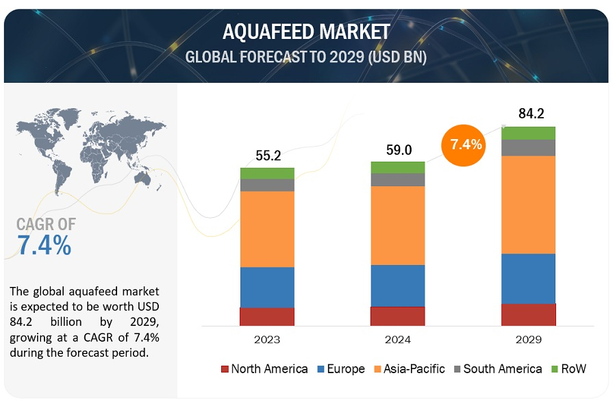 전 세계 아쿠아 피드 시장은 2024년 590억 달러에서 2029년 842억 달러에 달할 것으로 예상되며, 금액 기준으로는 예측 기간 동안 7.4%의 연평균 성장률로 아쿠아 피드 시장 규모가 커질 것으로 전망됩니다. 해산물에 대한 수요와 양식 기술의 혁신이 아쿠아 피드 시장의 성장을 주도하고 있습니다. FAO에 따르면 2022년 전 세계 양식 생산량은 1억 3,090만 톤으로 사상 최고치를 기록했으며, 이는 전 세계 어류 생산량의 51%에 해당합니다. 이러한 양식업의 급증으로 인해 양식 어종의 최적의 성장과 건강을 보장하기 위해 고품질의 양식용 사료에 대한 수요가 증가했습니다.