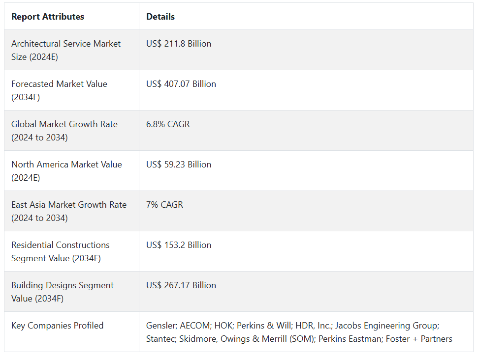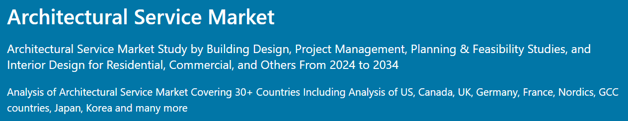 Fact.MR이 발표한 새로운 산업 보고서에 따르면, 2024년 전 세계 건축 서비스 시장의 매출은 미화 2,118억 달러에 달할 것으로 분석되며, 연평균 성장률(CAGR) 6.8%로 증가하여 2034년에는 미화 4,070억 7천만 달러에 이를 것으로 예상됩니다.