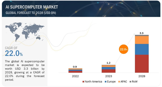 AI 슈퍼컴퓨터 시장은 2023년 12억 달러에서 2028년 33억 달러로 성장할 것으로 예상되며, 이 기간 동안 연평균 성장률(CAGR)은 22.0%에 달할 것으로 보입니다. 최근 몇 년 동안 의료 분야에서 AI 슈퍼컴퓨터의 활용이 크게 증가하였으며, 이는 복잡한 문제 해결, 의료 연구 개선, 진단 능력 향상 등에 기여하고 있습니다. AI 슈퍼컴퓨터는 분자 상호작용 시뮬레이션, 신약 후보 예측, 화합물 행동 시뮬레이션 등을 통해 신약 개발을 가속화하고 있습니다.