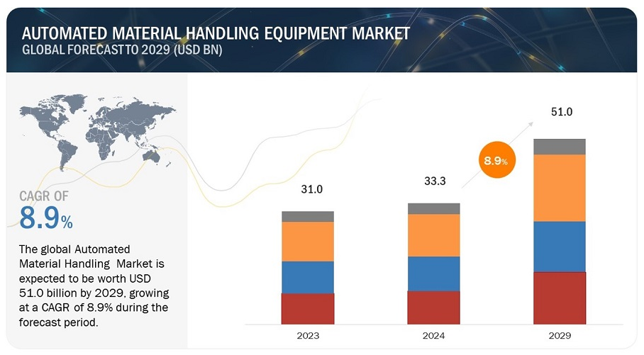 전 세계 자동 자재 취급 장비 시장 규모는 2024년 333억 달러에서 2029년 510억 달러로 2024년부터 2029년까지 8.9%의 연평균 성장률로 성장할 것으로 전망됩니다. 창고 자동화를 위한 로봇 솔루션을 제공하는 스타트업의 증가, 주요 산업에서 자동화 자재 취급 장비의 인기 증가, 인건비 및 안전에 대한 우려 증가 등 다양한 요인에 의해 시장 성장이 촉진될 것으로 예상됩니다. 동남아시아의 내부물류 부문이 확대되면서 헬스케어 산업의 잠재적 전망과 함께 유망한 성장 기회를 제공하고 있습니다. IoT 및 데이터 분석과의 통합, 린 제조 및 JIT(Just-In-Time) 관행에 대한 수요도 시장 확대에 기여하고 있습니다. 중소기업을 위한 자동화 자재 취급 장비의 높은 초기 비용과 높은 통합 및 전환 비용과 같은 과제는 시장 성장에 제약을 가하고 있습니다. 시스템 운영을 처리할 수 있는 기술 전문 지식과 숙련된 인력의 부재는 다양한 산업에서 자동화 솔루션의 채택과 구현을 방해할 수 있습니다.