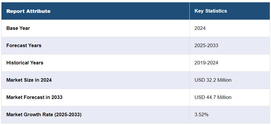 전 세계 자동 베이비 스윙 시장 규모는 2024 년 미화 3220 만 달러에 달했습니다. 앞으로 IMARC Group은 2025-2033년 동안 3.52%의 성장률 (CAGR )을 보이며 2033년까지 시장이 4,470만 달러에 이를 것으로 예상하며, 제품이 제공하는 편의성, 편안함, 안전성 및 미학, 부모의 바쁜 일정 및 고급 제품 변형의 도입이 시장을 이끄는 주요 요인 중 일부를 나타냅니다.