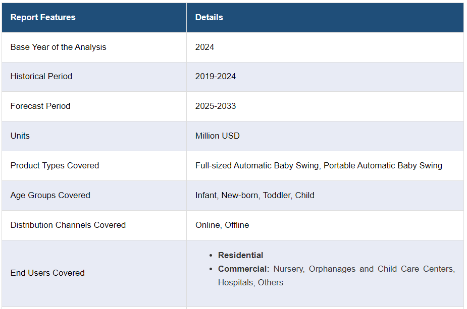 시장을 이끄는 주요 요인 중 하나는 일하는 부모들의 바쁜 라이프스타일로 인해 편의성이 최우선 순위가 된 것입니다. 이로 인해 부모가 다른 일을 하거나 휴식을 취하는 동안 아기를 달래줄 수 있는 핸즈프리 솔루션을 제공하는 자동 아기 그네의 채택이 증가하고 있습니다. 리모컨이나 스마트폰 앱으로 그네를 조작할 수 있는 기능도 편리함을 더합니다. 또한, 자동 그네는 아기가 안전하고 편안하게 쉬고 놀 수 있는 환경을 제공하여 전 세계적으로 그 수요가 증가하고 있습니다. 이 외에도 자동 그네의 안전 기능은 수년에 걸쳐 크게 향상되어 안전 기준을 충족하거나 초과하는 수많은 고급 모델이 있습니다. 이 외에도 제조업체는 그네가 안정적이고 안전한지 확인하기 위해 고품질 재료와 견고한 프레임을 사용하고 있습니다. 또한 하네스 및 자동 차단과 같은 기능을 갖춘 자동 아기 그네를 도입하여 안전성을 더하고 있습니다. 이와 함께 자동 그네의 디자인과 심미성은 또 다른 주요 성장 유발 요인입니다. 예를 들어, 다양한 색상, 패턴, 소재가 출시되면서 부모들은 집안 장식과 개인 스타일에 어울리는 그네를 선택하게 되었습니다. 또한, 블루투스 연결, 내장 음악, 속도 및 모션 설정 조절 등 자동 그네에 기술을 통합하여 아기와 부모 모두에게 개인화된 경험을 제공합니다. 이러한 요인으로 인해 시장은 향후 몇 년 동안 긍정적 인 전망을 창출 할 것으로 예상됩니다.