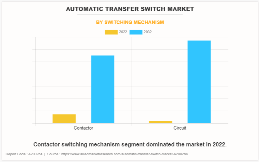 2022년에는 접촉기 부문이 자동 전환 스위치 시장의 지배적인 주자로 부상하여 전 세계 시장 수익의 대부분을 차지했습니다. 이 부문은 주로 산업 부문, 특히 ATS 시스템을 통해 고전압 공정의 안정적인 운영을 필요로 하는 제조 공장의 급속한 확장에 따른 수요 증가로 인해 상당한 비중을 차지했습니다.