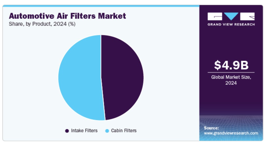 글로벌 자동차 에어 필터 시장 규모는 2024년에 미화 48억 6천만 달러로 추정되었으며, 2025년부터 2030년까지 연평균 5.7% 성장할 것으로 예상됩니다. 이 시장은 전 세계적으로 차량에 공기 필터가 더 많이 채택되는 데 영향을 미치는 여러 요인에 의해 주도되고 있습니다. 주요 요인 중 하나는 차량 내부와 외부 모두에서 공기질 문제에 대한 인식이 높아지고 있다는 점입니다. 점점 더 많은 소비자와 자동차 제조업체가 건강과 환경 문제를 우선시함에 따라, 차량 실내에서 오염 물질, 알레르기 유발 물질, 입자상 물질을 제거하는 공기 필터에 대한 수요가 증가했습니다.