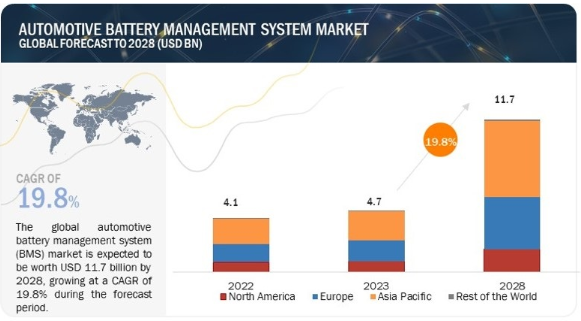 전 세계 자동차 배터리 관리 시스템(BMS) 시장 규모는 2023년 47억 달러에서 2028년 117억 달러로 2023년부터 2028년까지 19.8%의 연평균 성장률(CAGR)로 성장할 것으로 예상됩니다. 몇 가지 요인이 자동차 BMS 시장의 성장을 견인하고 있습니다. 예를 들어, 전기 자동차(EV)와 하이브리드 전기 자동차(HEV)의 인기가 높아지면서 리튬 이온 배터리의 사용이 증가하여 성능, 효율성 및 안전성을 제어하기 위한 BMS가 필요해졌습니다. 또한 환경 보호에 관한 정부의 의무가 증가함에 따라 자동차 배터리 관리 시스템 산업의 성장률이 증가하고 있습니다.