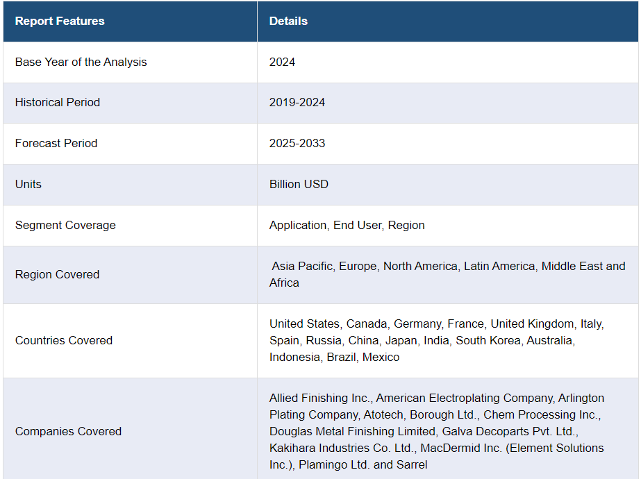 IMARC 그룹은 글로벌 자동차 크롬 시장 보고서의 각 하위 세그먼트의 주요 동향에 대한 분석과 함께 2025-2033 년 글로벌, 지역 및 국가 수준의 예측을 제공합니다. 이 보고서는 애플리케이션과 최종 사용자를 기준으로 시장을 분류했습니다.