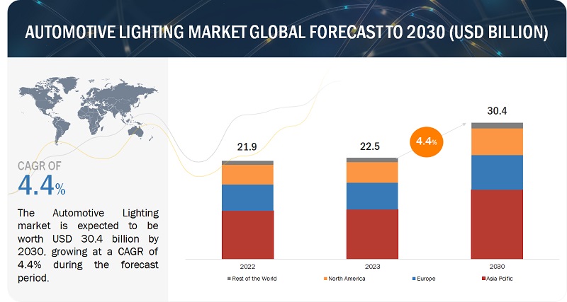 [378 페이지 보고서] 자동차 조명 시장은 2023년 225억 달러에서 2030년 304억 달러로 4.4%의 CAGR로 성장할 것으로 전망됩니다. 자동차 조명 시장은 정부의 안전 규제, 비용 효율적인 조명 솔루션의 개발, 편안함과 고급스러움에 대한 수요 증가로 인해 실내 조명에 대한 수요가 증가하면서 주도하고 있습니다. LED 조명은 에너지 효율성, 내구성, 매트릭스 및 OLED 기술과 같은 고급 기능으로 인해 시장을 선도하고 있습니다. 또한 제조업체들이 개인화 기능을 통해 향상된 인테리어 스타일과 새로워진 매력을 우선시함에 따라 중급 및 프리미엄급 차량에 앰비언트 및 장식용 조명을 채택하는 추세도 확대되고 있습니다. 아시아 태평양 지역은 차량 생산량 증가와 급속한 산업화에 힘입어 여전히 가장 큰 시장으로 남아 있습니다.