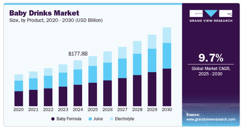 전 세계 유아용 음료 시장 규모는 2024년에 1,778.8억 달러로 평가되었으며 2025년부터 2030년까지 9.7%의 연평균 성장률을 보일 것으로 예상됩니다. 전자 상거래 및 퀵 커머스 서비스의 보급률 증가, 다양한 지역의 인구 증가, 유아기부터 어린이 성장에서 영양의 역할에 대한 인식 증가, 여러 지역에서 운영되는 주요 기업이 제공하는 다양한 대안의 가용성이 주로 성장 기회를 더하고 있습니다.