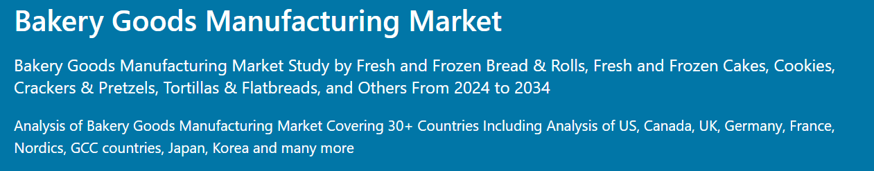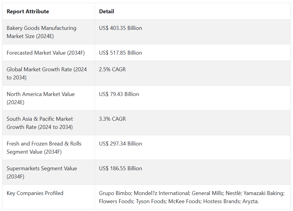 2024년부터 2034년까지 제빵 제품 제조업에 대한 전 세계 수요는 연평균 2.5%의 성장률을 보일 것으로 예상됩니다.