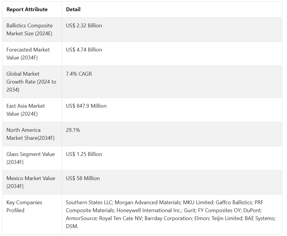 전 세계 탄도 복합 재료 시장의 규모는 2024년에 미화 23억 2천만 달러에 이를 것으로 추정됩니다. 매출은 연평균 7.4% 성장하여 2034년 평가 기간 말에는 미화 47억 4천만 달러에 이를 것으로 예상됩니다.