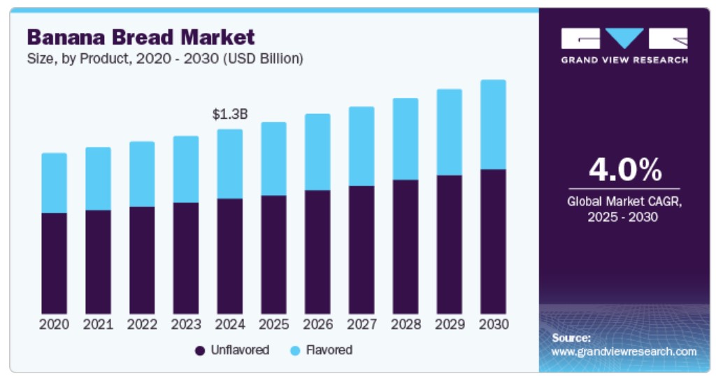 글로벌 바나나 빵 시장 규모는 2024년 13억 달러로 평가되었으며, 2025년부터 2030년까지 연평균 4.0%의 성장률을 보일 것으로 예상됩니다. 자연에서 얻은 재료를 사용하여 간단하고 가공이 덜 된 구운 식품을 요구하는 건강에 민감한 소비자의 급속한 증가는 시장 발전에 도움이 되는 주요 요인입니다. 또한, 소셜 미디어 플랫폼을 통한 판촉 활동과 월마트, 테스코, 세븐일레븐과 같은 주요 매장의 매장 내 판촉 활동으로 인해 이 빵 유형에 대한 인식이 높아지면서 향후 몇 년 동안 제품 혁신이 촉진될 것으로 예상됩니다. 코로나19 대유행 기간 동안 더욱 활성화된 홈 베이킹 트렌드의 출현으로 인해 초콜릿, 딸기, 바닐라와 같은 다양한 건강 재료와 맛을 가미한 바나나 빵을 준비하는 것이 장려되었습니다.
