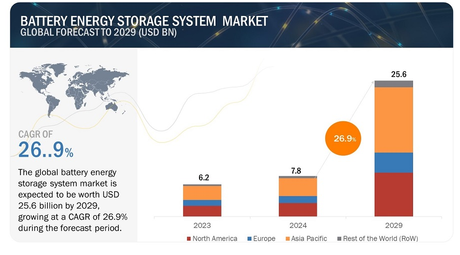 전 세계 배터리 에너지 저장 시장 규모는 2024년 78억 달러로 추정되며, 예측 기간 동안 26.9%의 연평균 성장률로 2029년에는 256억 달러에 달할 것으로 예상됩니다. 배터리 에너지 저장 시스템(BESS)은 다양한 소스에서 에너지를 저장했다가 필요에 따라 방출하는 충전식 시스템입니다. 하나 이상의 배터리로 구성된 BESS는 전력망의 균형을 맞추고, 백업 전력을 제공하며, 전력망 안정성을 향상시키는 데 도움이 됩니다.