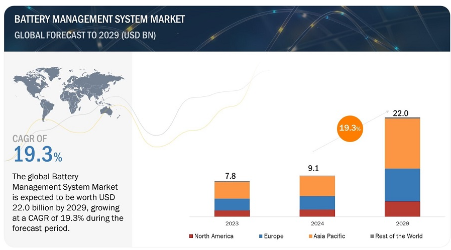 배터리 관리 시스템(BMS) 시장은 2024년 91억 달러에서 2029년 220억 달러로 예상 매출이 크게 성장할 것으로 예상되며, 검토 기간 동안 19.3%의 주목할 만한 CAGR을 기록할 것으로 전망됩니다. BMS는 충전식 배터리, 특히 리튬 이온 배터리를 효율적으로 모니터링하고 제어하여 최적의 에너지 활용을 보장하는 데 필수적인 전자 시스템 역할을 합니다. 소프트웨어와 하드웨어 구성 요소로 구성된 BMS는 과충전으로부터 셀 보호, 충전 및 방전 프로세스 감독, 배터리 충전 상태 및 상태 평가, 셀 밸런싱, 배터리 수명 및 성능 향상, 온도 및 전압 수준 모니터링과 같은 중요한 작업을 수행합니다. BMS의 주요 응용 분야는 전기 자동차, 통신, 산업 기계, 재생 에너지 시스템 등을 포함합니다.