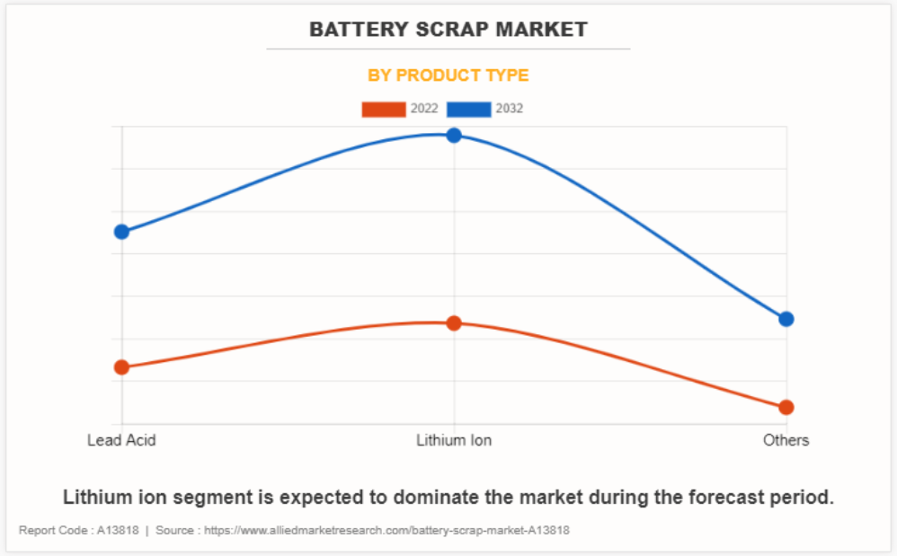 출처에 따르면, 전기 자동차 부문은 2022년 매출 기준으로 전 세계 배터리 스크랩 시장 규모의 거의 5분의 3을 차지하며 가장 높은 시장 점유율을 기록했으며, 예측 기간 내내 선두 지위를 유지할 것으로 예상됩니다. 전기 자동차(EV)는 주로 리튬이온 배터리의 교체로 인해 배터리 폐기 시장에 기여합니다. 이러한 중고 EV 배터리의 재활용과 재활용은 배터리 폐기 산업에 상당한 영향을 미치는 전기 자동차 부문의 자원 보존, 환경 지속 가능성, 책임 있는 성장에 중요한 역할을 합니다.