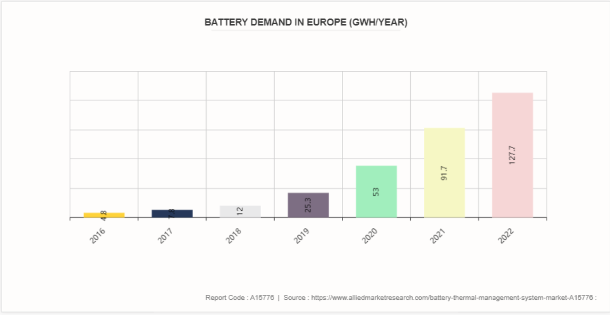 또한, 배터리 열 관리 시스템(BTMS)에 사물인터넷(IoT) 기능을 통합하면 배터리 열 관리 시스템 시장 전망에 유리한 기회를 제공할 수 있습니다. 배터리 열 관리 시스템(BTMS)에 사물인터넷(IoT) 기능을 통합하면 전기 자동차(EV)와 에너지 저장 시스템(ESS) 배터리의 관리와 최적화에 혁신적인 도약이 될 수 있습니다. IoT 통합은 실시간 모니터링, 예측 유지보수, 향상된 성능 최적화를 가능하게 함으로써 새로운 서비스 기반 수익원을 창출하고 전반적인 운영 효율성을 향상시킵니다. 실시간 모니터링은 BTMS에 IoT를 통합할 때 얻을 수 있는 주요 이점 중 하나입니다. 배터리 시스템에 센서와 연결 모듈을 장착함으로써 제조업체와 운영자는 온도, 전압, 전류, 충전 상태와 같은 중요한 데이터 포인트에 즉시 액세스할 수 있습니다. 이러한 실시간 데이터는 배터리 상태와 성능 지표를 지속적으로 모니터링할 수 있게 해줌으로써, 운영 상태와 잠재적 문제에 대한 통찰력을 제공하여 문제가 확대되기 전에 이를 방지할 수 있게 해줍니다. 예를 들어, 온도나 전압의 이상 징후를 조기에 감지하여 과열이나 잠재적 배터리 고장을 방지하기 위한 사전 개입 경보를 발동할 수 있습니다. 2023년 유럽에서는 전기 자동차 신규 등록이 크게 증가하여 총 320만 대에 달했으며, 이는 전년 대비 약 20% 증가한 수치입니다. 유럽연합 내에서만 전기 자동차 판매량이 240만 대에 달해 유럽 전역에서 관찰된 강력한 성장률을 반영했습니다. 이러한 추세는 중국의 역동적인 전기 자동차 시장과 유사하며, 유럽 시장이 성숙함에 따라 지속적인 강력한 성장을 나타냅니다. 또한, 여러 유럽 국가에서 올해 전기 자동차 채택에 있어 주목할 만한 이정표를 달성했습니다.