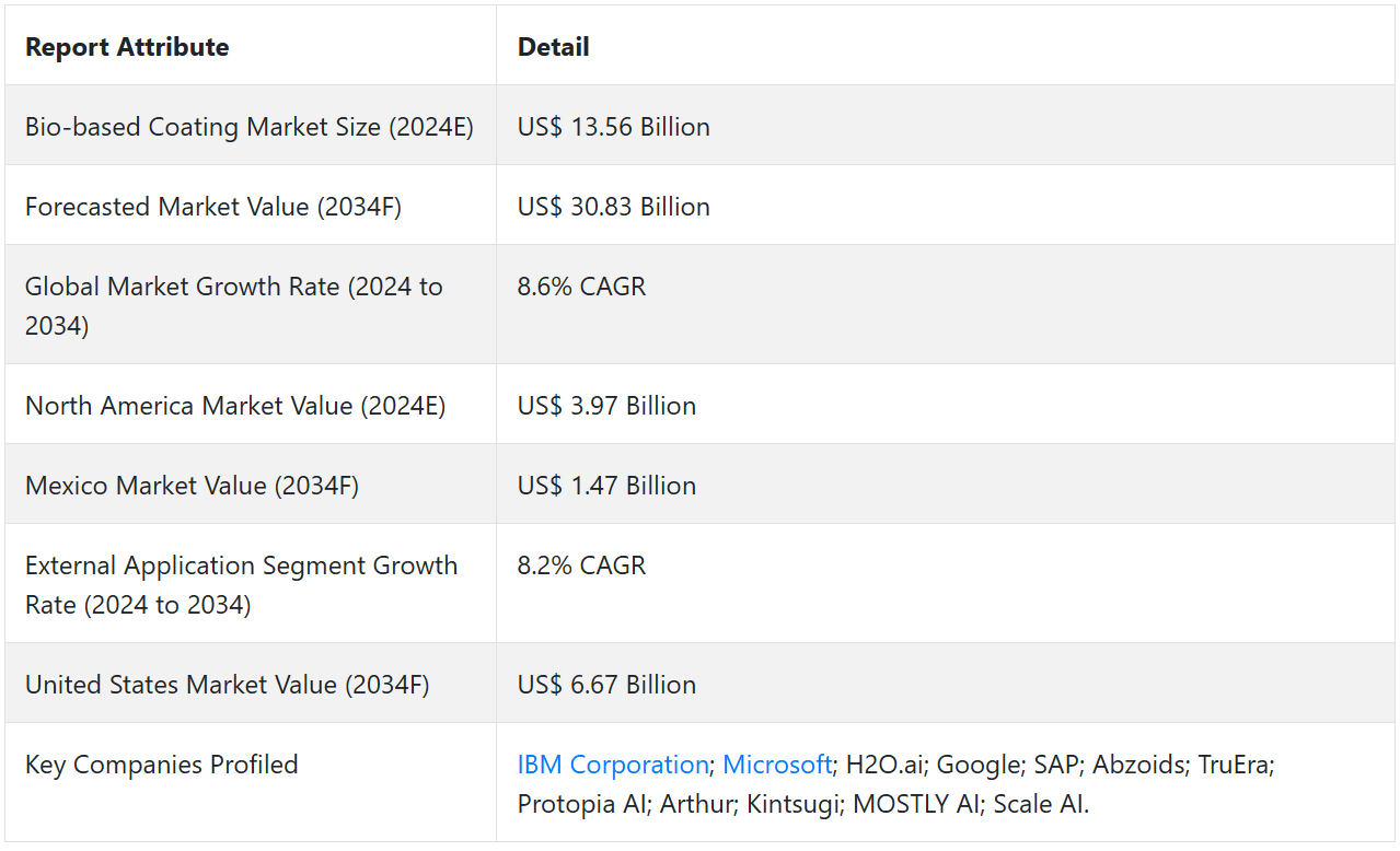 현재 바이오 기반 코팅 시장은 2024년 135억 6천만 달러에서 2034년까지 308억 3천만 달러로 성장할 것으로 예상되며, 이 기간 동안 연평균 8.6%의 성장률을 기록할 것으로 보입니다. 이는 환경에 대한 인식 변화와 함께 지속 가능한 제품에 대한 소비자 요구가 증가하고 있기 때문입니다. 공급업체들은 새로운 응용 분야를 개발하고 있으며, 시장의 다양한 세그먼트에서 혁신을 지속하고 있습니다.