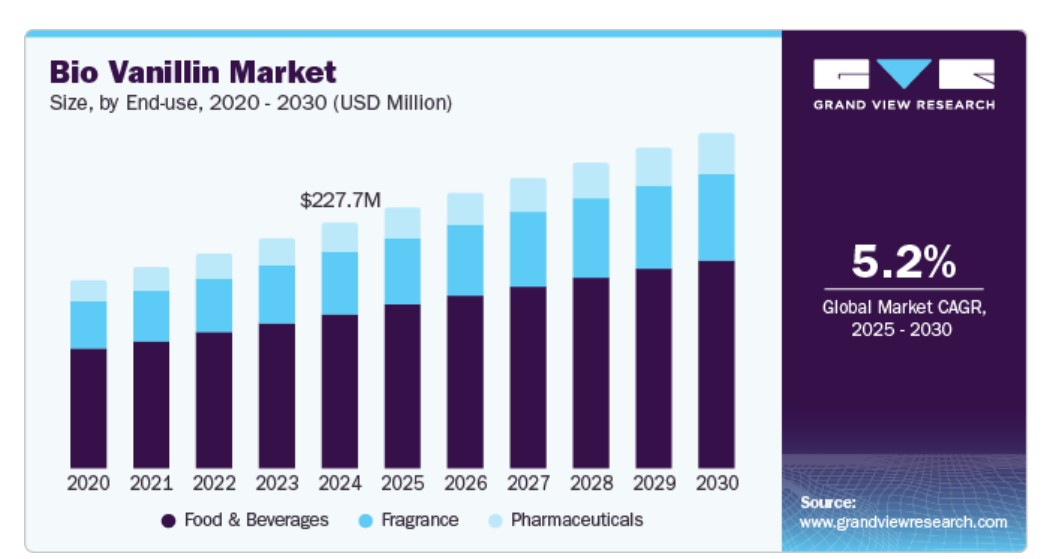 글로벌 바이오 바닐린 시장 규모는 2024년 2억 2,770만 달러로 추정되었으며, 2025년부터 2030년까지 연평균 5.2% 성장할 것으로 예상됩니다. 이러한 성장은 천연 제품에 대한 소비자 선호도가 증가하고 합성 첨가제의 부작용에 대한 인식이 높아졌기 때문입니다. 또한, 유기농 식품으로의 전환과 함께 식음료 산업에서 클린 라벨 성분에 대한 수요가 증가하고 있습니다. 또한, 재생 가능한 원료에서 바이오바닐린을 생산하는 생명공학 공정의 발전은 합성 바닐린에 대한 지속 가능한 대안으로서의 매력을 강화하여 시장 확장을 더욱 촉진합니다.