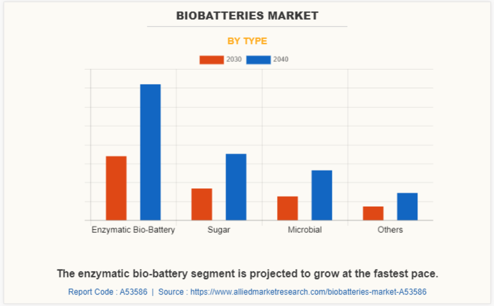이 배터리는 생물학적 분자를 사용하여 다른 생물학적 분자를 분해하고, 그 과정에서 전자를 방출하며, 유기 화합물로 만들어진 배터리에 에너지를 저장할 수 있도록 합니다. 바이오 배터리 시장은 재생 가능하고 오염이 없기 때문에 주로 환경적 이점에 의해 주도됩니다. 또한 풍부하게 존재하며 상온에서 사용할 수 있습니다.