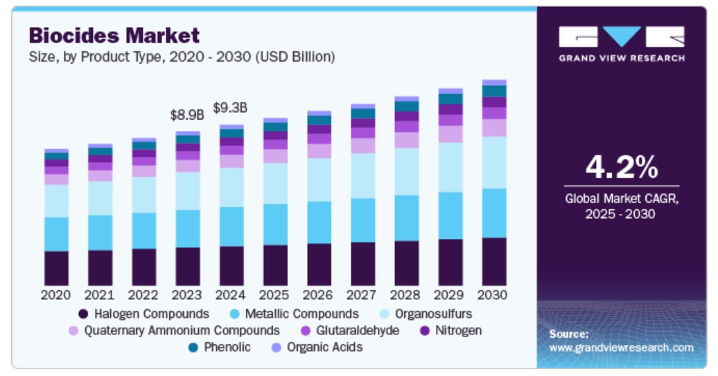 할로겐 화합물 부문은 2024년 가장 큰 매출 시장 점유율인 28.5%를 차지했으며, 예측 기간 동안 계속해서 업계를 지배할 것으로 예상됩니다. 이는 살생물제 조성물에 염소, 불소, 요오드와 같은 할로겐이 사용되기 때문입니다. 요오도포르라고 알려진 또 다른 요오드 기반 화합물은 요오드의 안정성과 살생물 효능을 향상시킵니다. 가장 많이 사용되는 할로겐 중 하나인 염소는 항균 및 산화제로서 매우 효과적이기 때문에 도시 식수 플랜트 및 폐수 처리 시설 등에 이상적입니다.