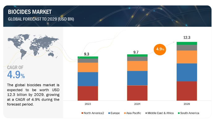 전 세계 살생물제 시장은 2024년 97억 달러 규모이며 2024년부터 2029년까지 연평균 4.9% 성장하여 2029년에는 123억 달러에 달할 것으로 예상됩니다. 살생물제는 화학적 또는 생물학적 방법을 사용하여 유해한 유기체를 관리하고 제거하도록 설계된 약제 또는 화합물입니다. 살생물제는 수처리 부문에서 저장 탱크, 파이프 라인 및 냉각탑의 미생물 성장을 방지하기 위해 사용됩니다. 살균제는 물 공급의 안전과 순도를 유지하고 부식을 줄이며 생물막의 발생을 막는 데 사용됩니다. 살생물제는 수처리, 산업 및 기관 청소, 가정 관리, 페인트 및 코팅, 목재 방부제, 박테리아, 곰팡이, 바이러스, 곤충, 설치류 및 기타 해로운 유기체를 제어하기 위한 기타 살균제와 같은 다양한 용도로 사용됩니다.