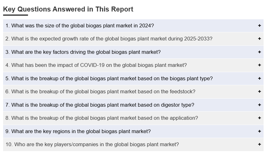에너지에 대한 전 세계적 수요가 증가하면서 시장이 주도되고 있습니다. 인구 증가, 도시화, 산업화가 이를 뒷받침하고 있습니다. 석탄과 천연가스와 같은 전통적인 화석 연료는 점점 더 부족해지고 비싸지고 있습니다. 이 때문에 소비자와 정부 모두 대체 가능한 지속 가능한 에너지원을 채택하는 경향이 강해지고 있습니다. 이와 함께, 특히 도시 지역과 농업 및 식품 생산을 포함한 대규모 산업 분야에서 폐기물 관리 문제가 증가하면서 혁신적인 해결책에 대한 필요성이 절실해지고 있습니다. 결과적으로, 바이오가스 기술을 채택하는 지자체와 기업은 폐기물 처리 및 매립과 관련된 비용을 줄일 수 있어, 시장 성장의 중요한 동력이 되고 있습니다. 또한, 지역 폐기물을 활용하여 바이오가스를 생산하면, 보다 안정적이고 지정학적 민감성이 적은 에너지 공급을 보장할 수 있어, 바이오가스 플랜트의 시장 성장을 촉진할 수 있습니다. 이와는 별개로, 광범위한 적용 가능성은 바이오가스 플랜트를 매력적인 투자 대상으로 만들어, 산업과 지자체가 바이오가스가 에너지 수요를 충족시킬 수 있는 다양한 방법을 인식함에 따라 시장 성장을 촉진합니다. 또한, 지역 농업과 폐기물 관리 서비스에 도움이 되는 통합 공급망의 광범위한 채택은 긍정적인 시장 전망을 만들어내고 있습니다.