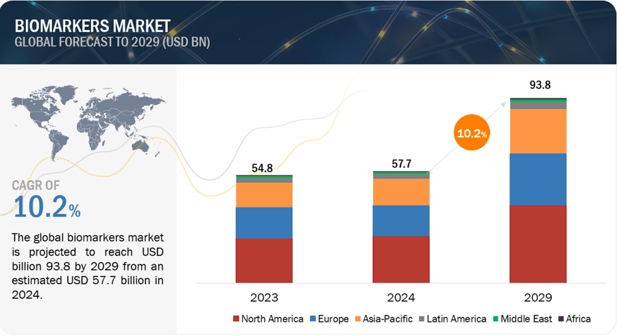글로벌 바이오마커 시장 규모는 2024년 577억 달러에서 2029년 938억 달러로 10.2%의 연평균 성장률로 성장할 것으로 예측됩니다. 신약 발견 및 개발에서 바이오마커의 중요성이 커지고 동반 진단의 중요성이 커지는 것이 바이오마커 시장을 이끄는 주요 요인입니다. 그러나 바이오마커 개발을 위한 높은 자본 투자와 긴 일정은 시장 성장을 저해할 수 있습니다.
